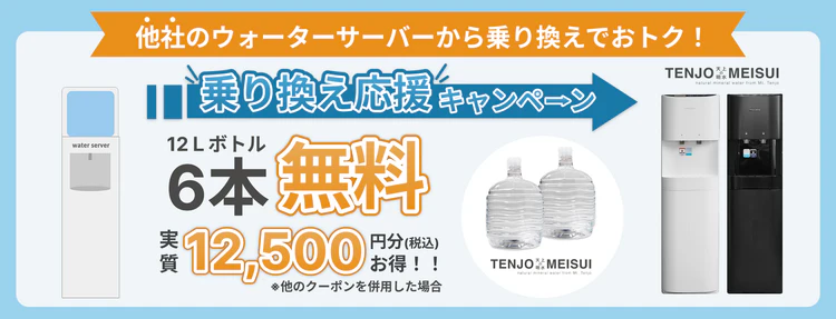 今天井の明水に乗り換えると「天井の明水(12ℓ×6本)」を無料でプレゼントしてくれます!