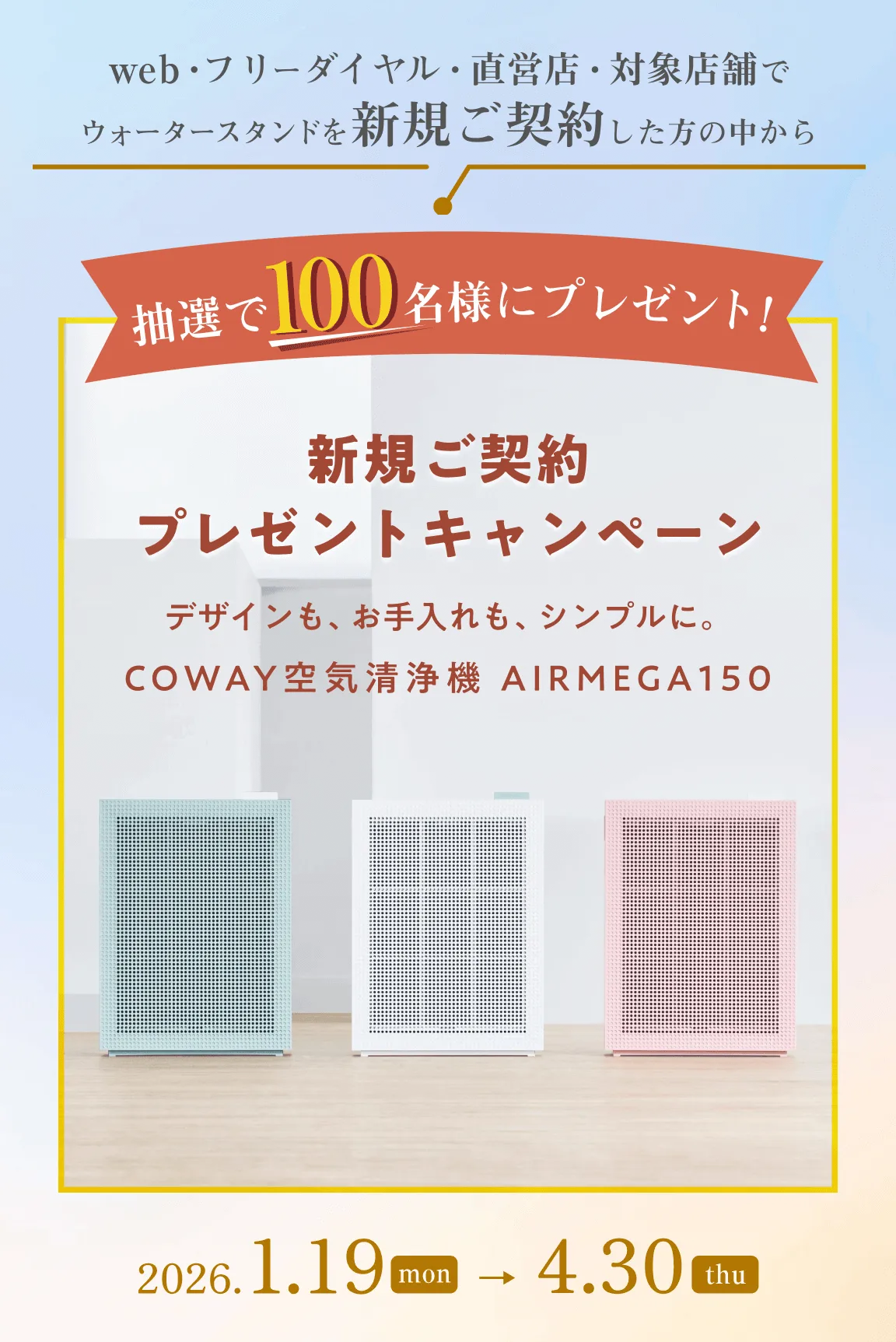 期間中に初めて契約した人の中から厳選された【COWAY 空気清浄機 AIRMEGA150】を抽選で100名にプレゼントしてくれます!